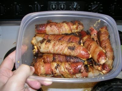 Bacon-wrapped, cheese-filled, battered and fried hot dogs