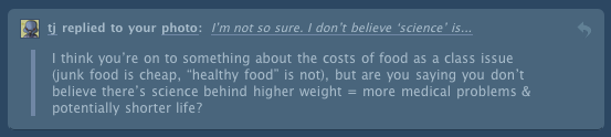 Does this mean I think it should be a matter of public policy to tell us what to eat? Probably not, at least not directly, but I also think that our public policy should stop subsidizing our own unhealthy behaviors. I don’t know about Australia, Ross, but here in the U.S., our multi-billion dollar corn subsidy is what makes a Coke made with corn syrup cheaper than one made with sugar. And it’s what allows for a 1200% markup on soda at fast food restaurants. (Given the nature of global macroeconomics, I’m pretty sure our corn subsidy is making its way into your diet too, even on the other side of the planet.) End that subsidy and you end those cheap calories that are causing obesity. When a Coke stops being so cheap that it’s a no-brainer, when people are forced to think about their eating decisions, maybe they start making healthy ones instead of letting their lizard brain just choose sugar, sat and fat.