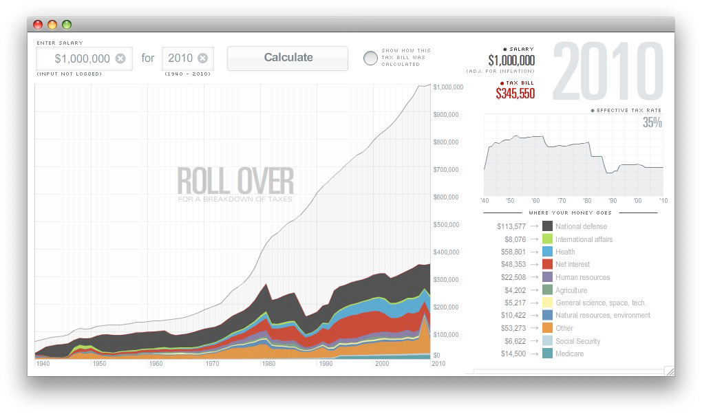 Nice piece of dataviz from couch and crew over at USA Today. Enter your salary and it will show you your tax bill (inflation adjusted even!) for the past 70 years. Even shows how national spending priorities have shifted over that time and what your share pays for. Really nice work.